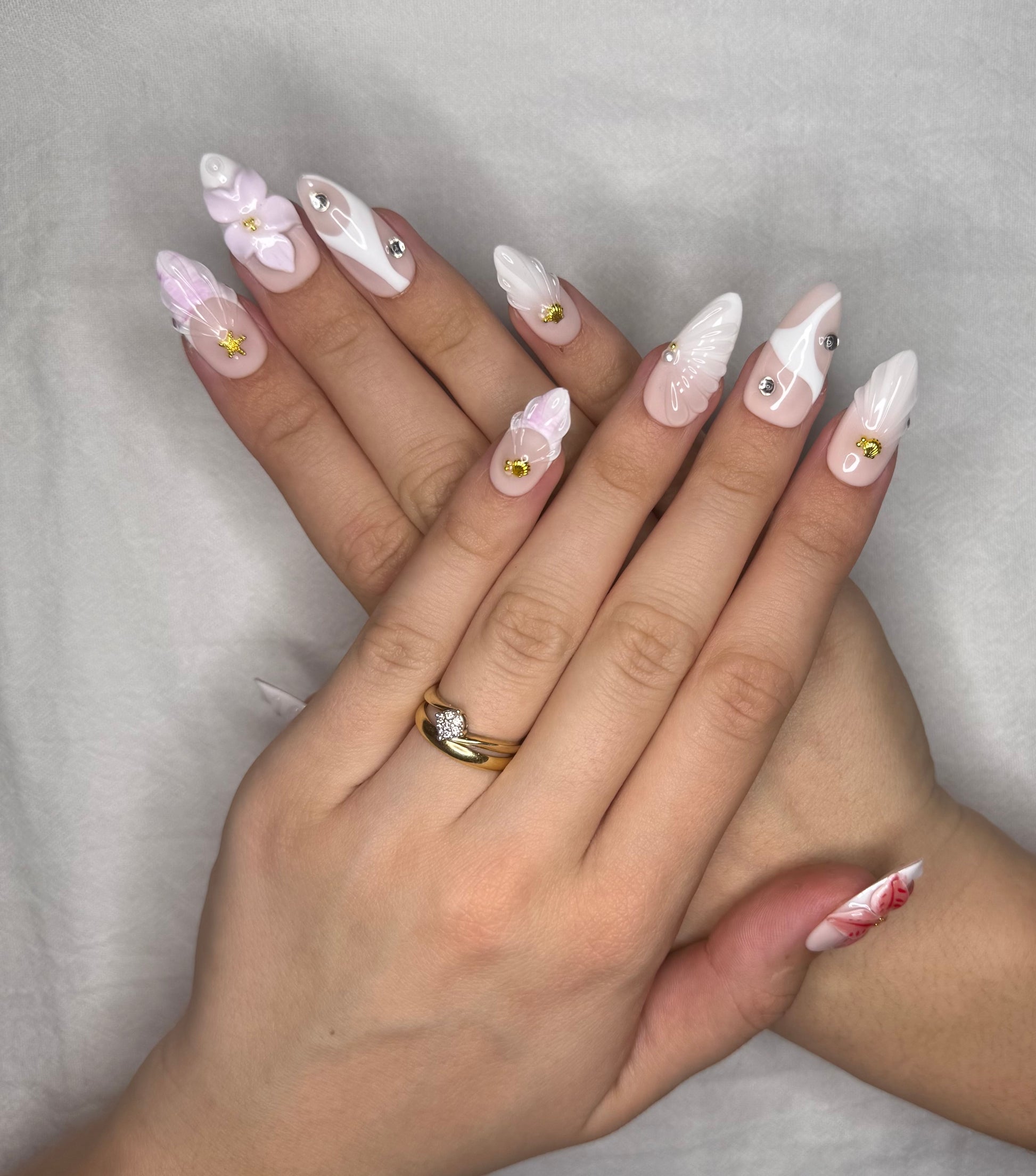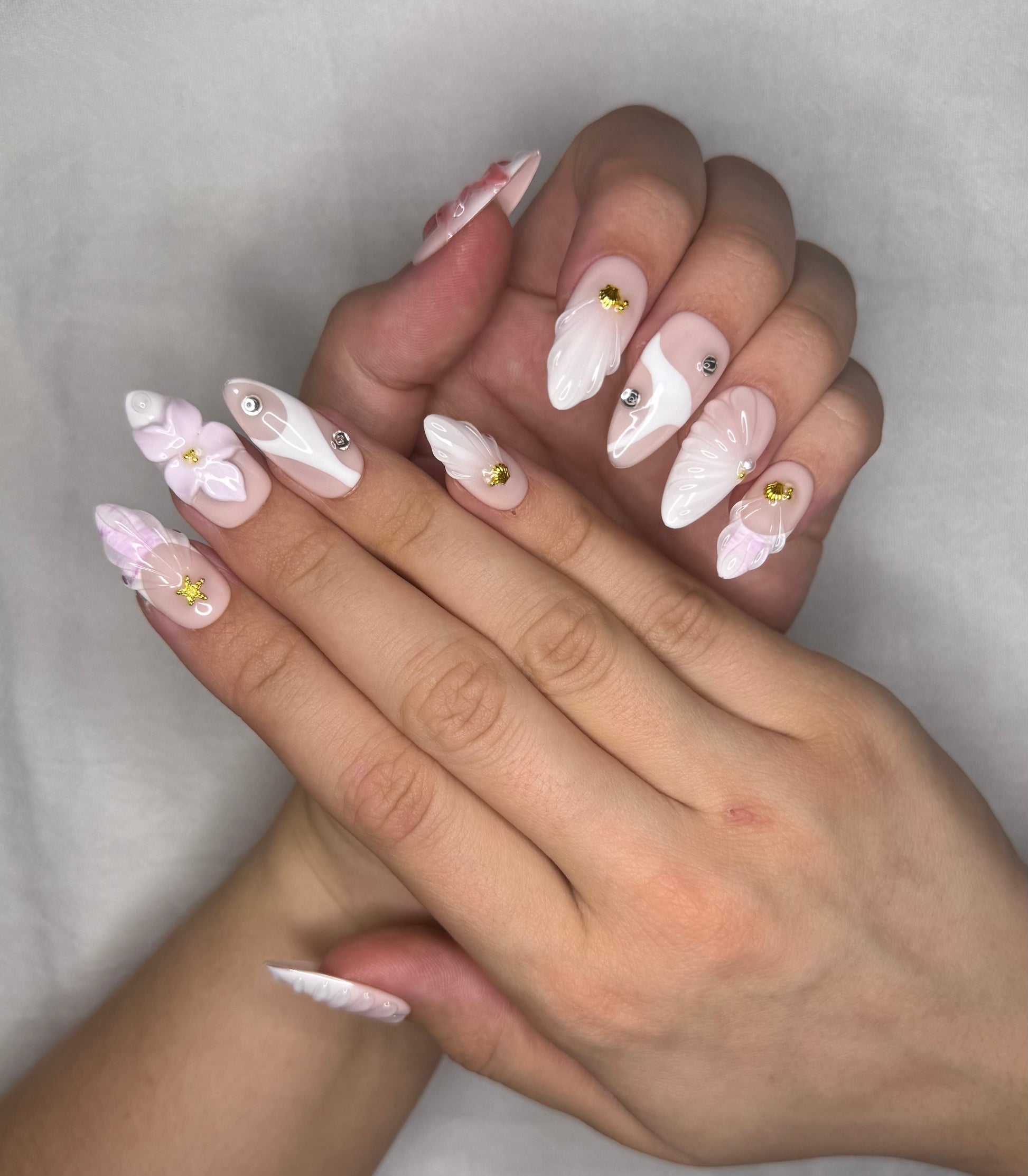 Découvrez Alicia, un set de nude rose nacré, parfait pour un look élégant et romantique. Avec ses fleurs 3D, ses coquillages sculptés, ses strass dorés et argentés, il sublime les mains en toute occasion. Idéal pour une manucure chic, sans passage en salon.