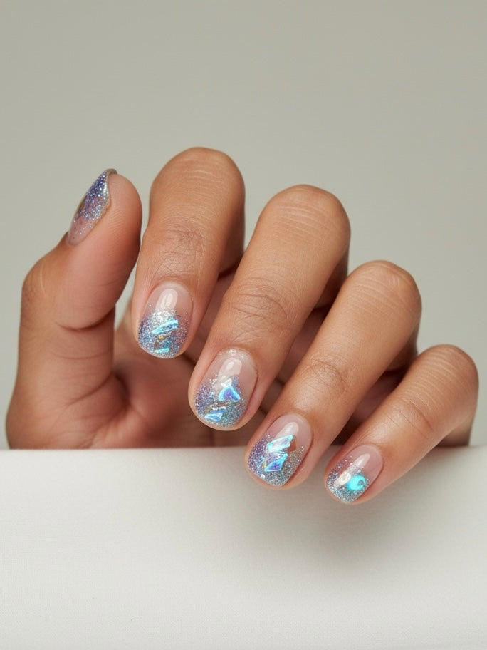 🦄Ce set de faux ongles réutilisables présente une base nude translucide avec un dégradé de paillettes violettes, créant un effet doux et onirique. Des détails en relief holographiques et dorés apportent une touche sophistiquée et lumineuse, captant la lumière pour un rendu féérique. La combinaison du violet et de l’or rappelle une aura mystique et élégante, idéale pour un look raffiné et original.