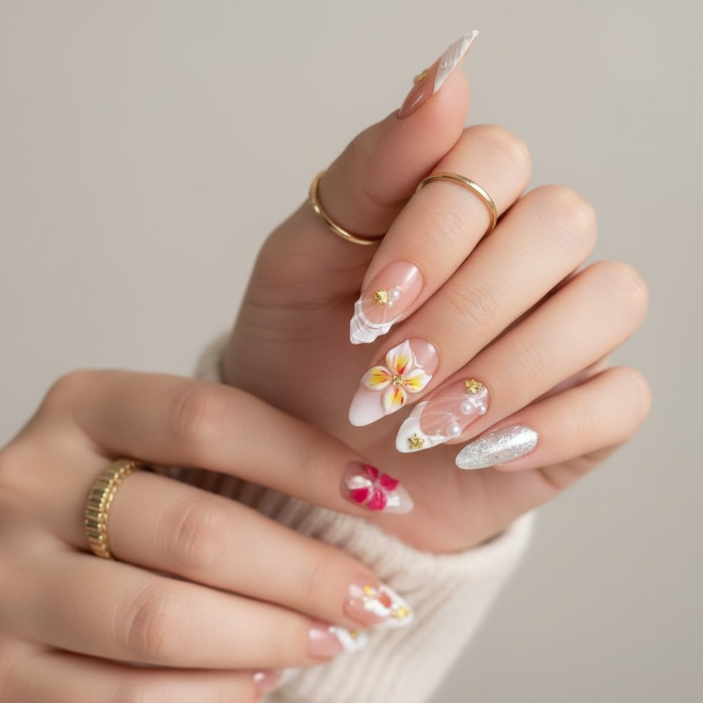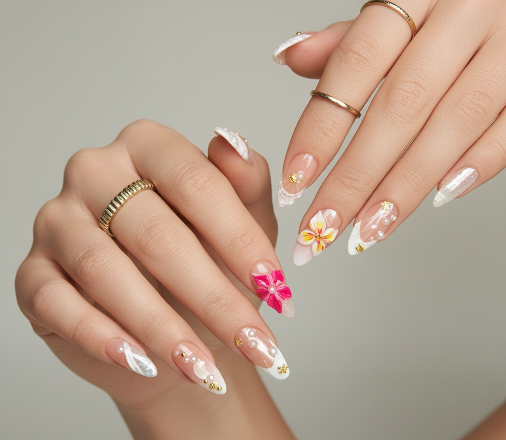 Ce set de press on nails nude et pastel allie perles, fleurs 3D et Ă©clats argentĂ©s pour une manucure Ă©lĂ©gante et lumineuse. IdĂ©al pour un look raffinĂ© mĂȘlant dĂ©tails floraux, paillettes et strass dorĂ©s. Parfait pour une pose d’ongles tendance, chic et rĂ©utilisable.