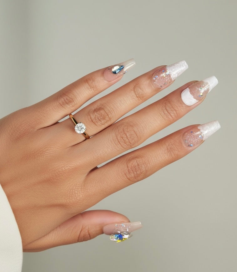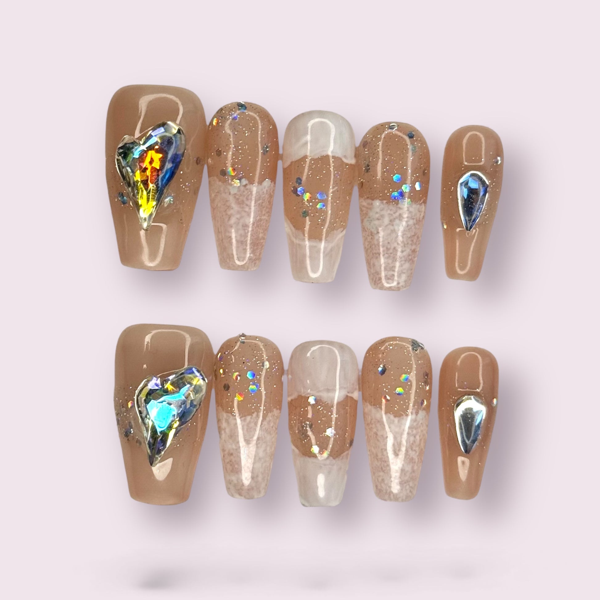 Ce set de faux ongles réutilisables mise sur une base nude translucide agrémentée de paillettes scintillantes et d’effets texturés blancs, rappelant un voile délicat ou du givre cristallin. Les ornements en pierres holographiques 3D en forme de cœur et de goutte apportent une touche luxueuse et romantique, captant la lumière pour un effet étincelant. L’association des reflets irisés et de la douceur du nude crée une esthétique raffinée et moderne.