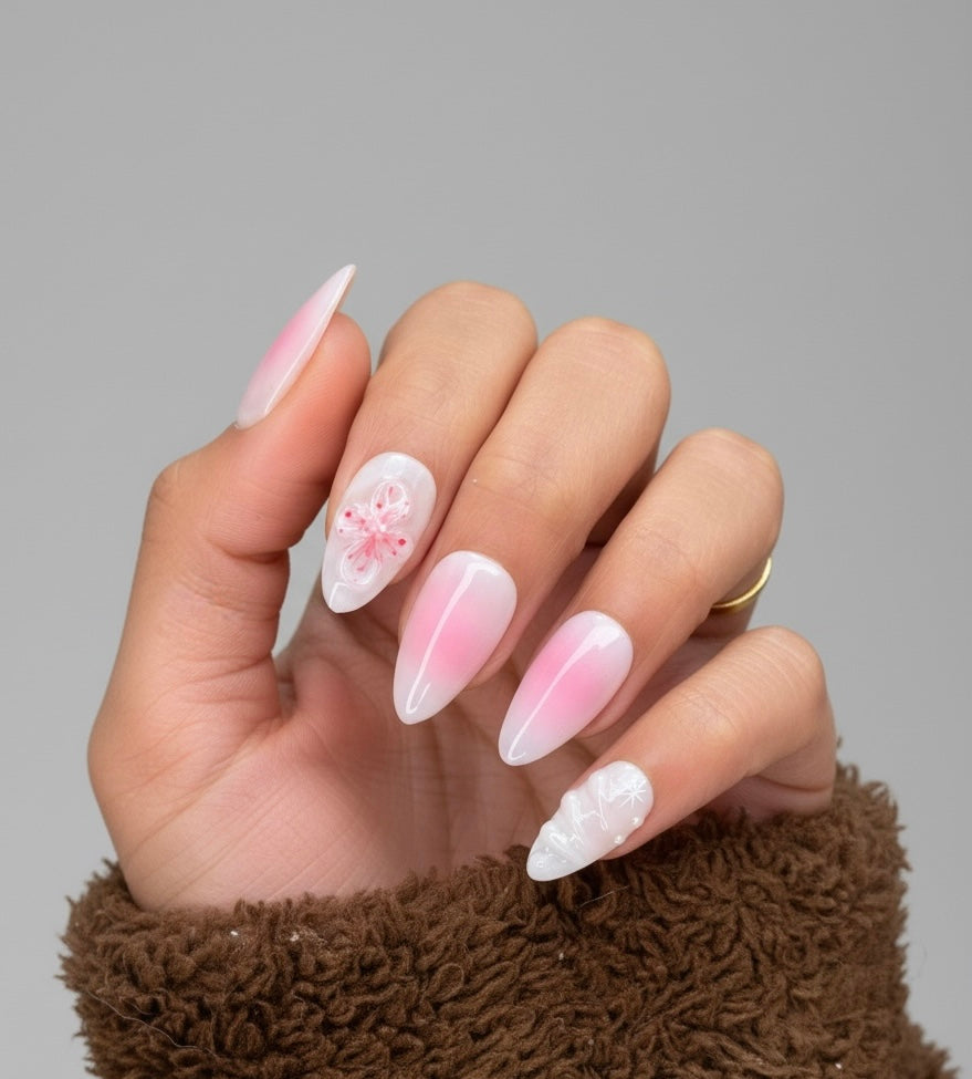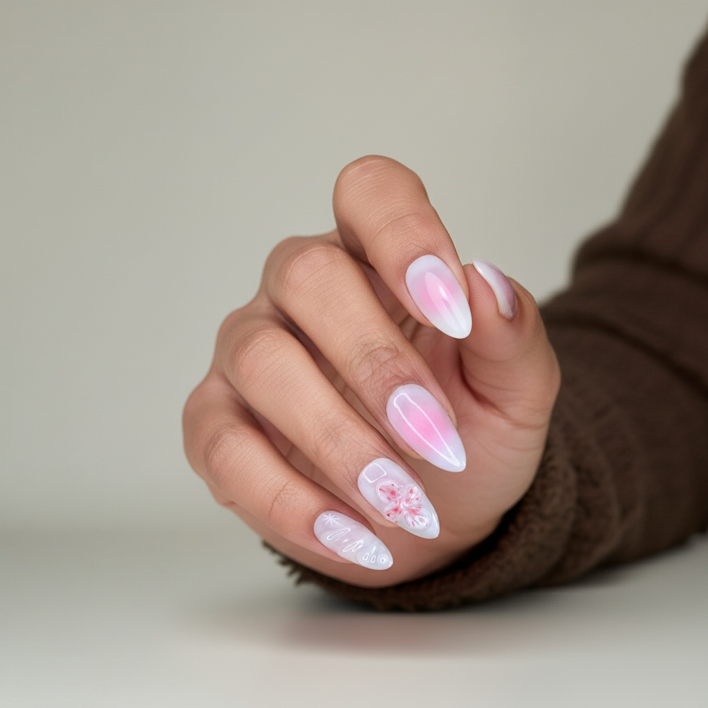 Plongez dans l’élégance discrète avec ce set de press on nails en dégradé rose et blanc. Chaque capsule est soigneusement conçue avec un effet ombré délicat et des motifs floraux en relief🌸