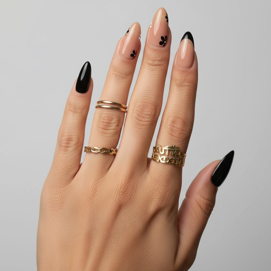đ€Affirmez votre style avec notre set de faux ongles Black Molly, un mĂ©lange parfait entre Ă©lĂ©gance et fĂ©minitĂ©. Ce design unique associe un noir intense sur ongles pleins et une French florale minimaliste sur une base nude transparente, agrĂ©mentĂ©e de petits dĂ©tails en pointillĂ©s. IdĂ©al pour celles qui aiment un look chic, raffinĂ© et lĂ©grement audacieux !âš