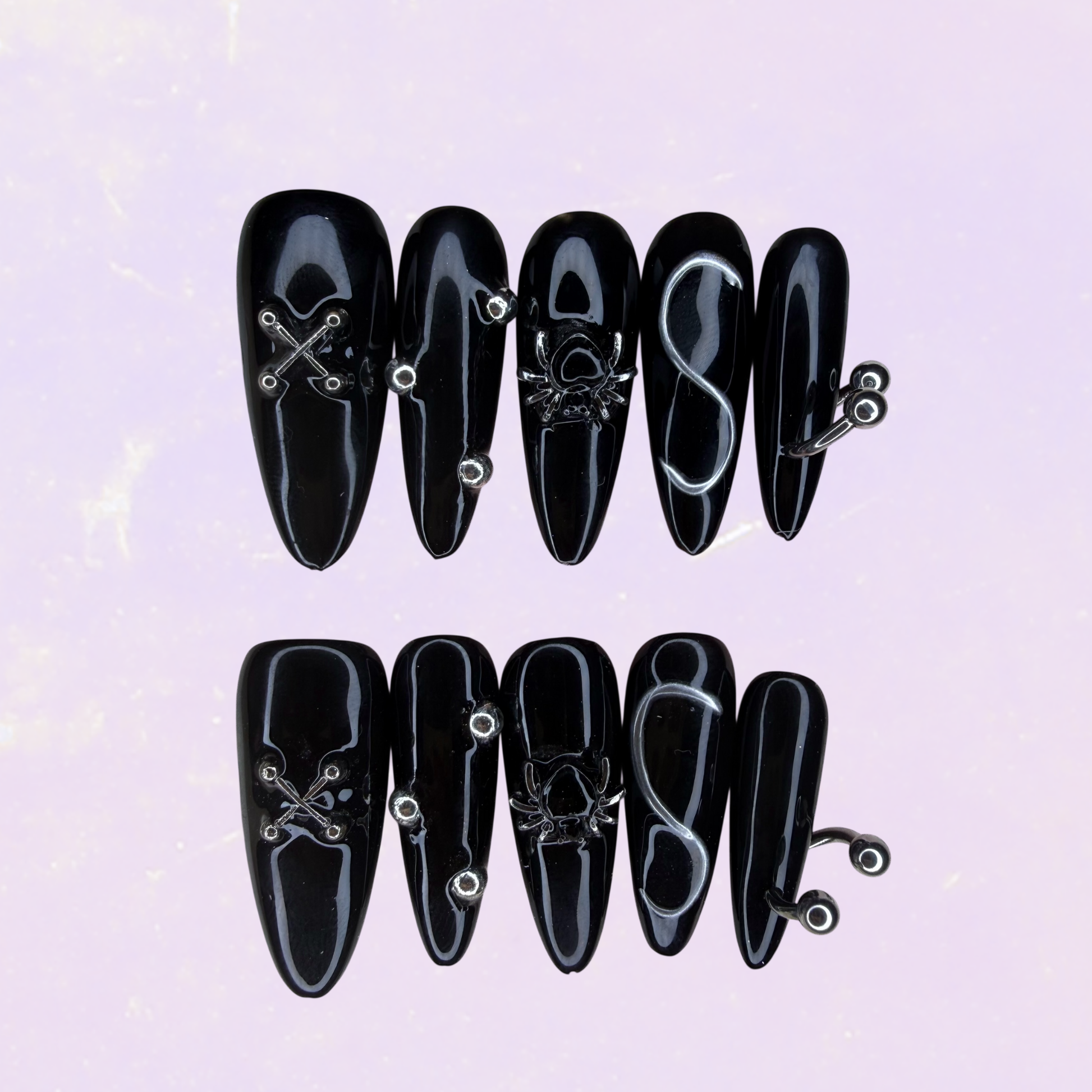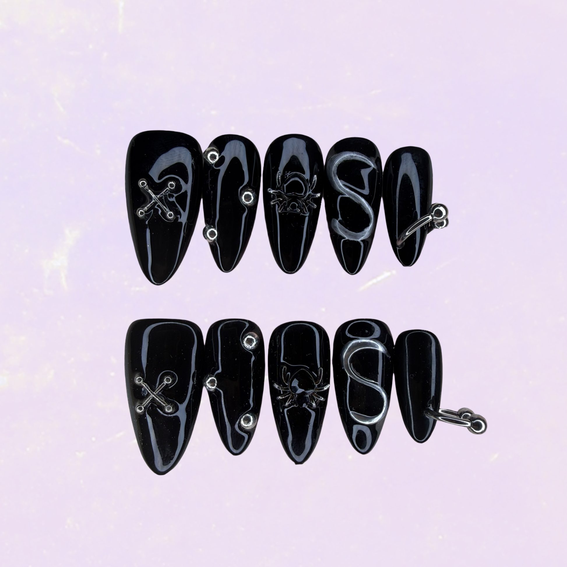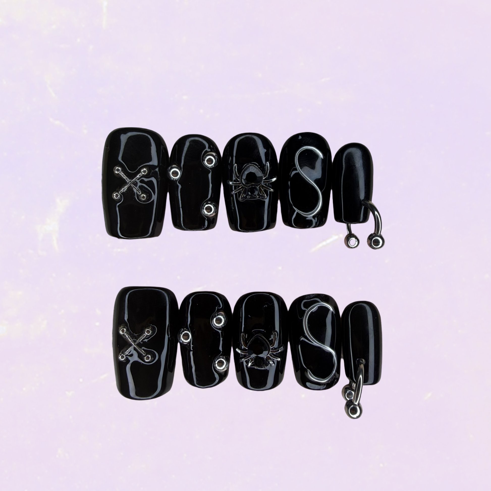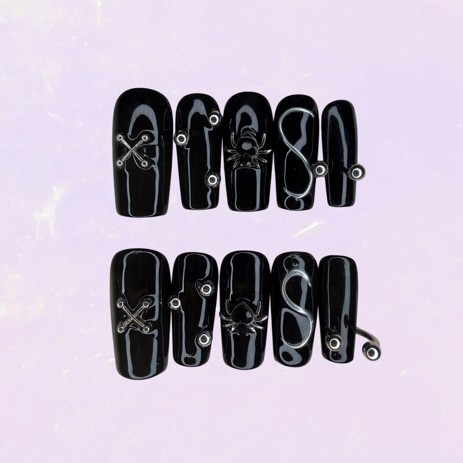 🖤Un set intense et envoûtant, mêlant le noir profond à des détails en 3D, des effets argentés et des ornements subtils. Idéal pour un look mystérieux et sophistiqué.🕷️