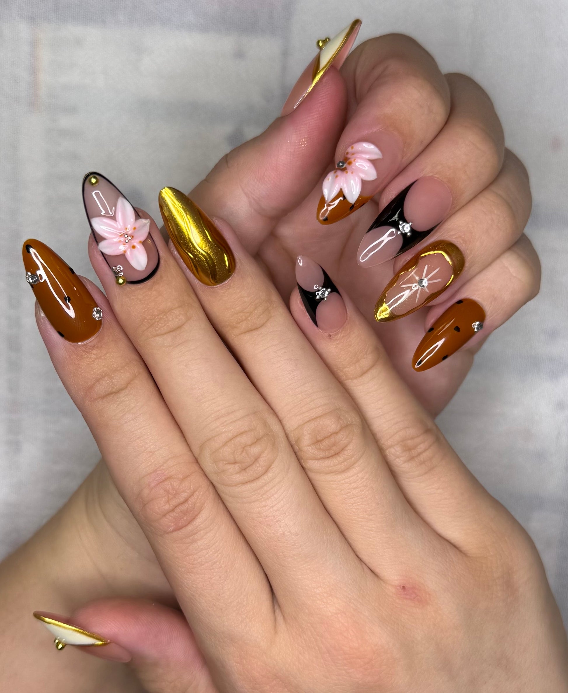 Ce set de press on nails allie nude, noir, doré et caramel pour une manucure élégante et affirmée. Avec ses finitions métalliques, dessins fins et fleur 3D, il offre un look moderne et sophistiqué. Idéal pour une pose d’ongles réutilisable, chic et tendance sans rendez-vous en institut.