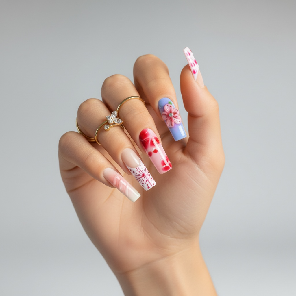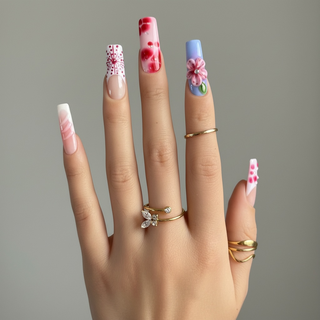 Un mix gourmand de fleurs 3D, ongle juteux et pois fun !