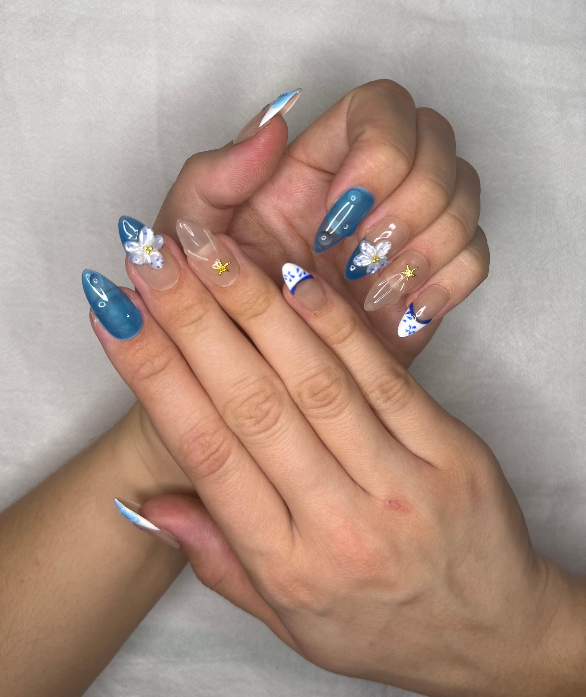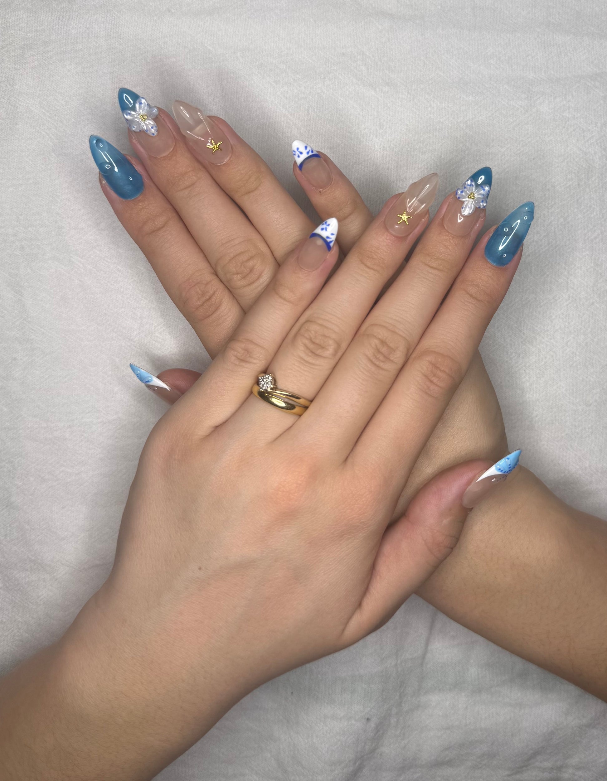 Ce set de press on nails bleu et nude s’inspire de l’été avec ses motifs qui rappelle l’eau, fleurs 3D et étoiles dorées. Idéal pour une manucure fraîche, éclatante et tendance, parfaite pour les vacances ou un look estival. Une pose d’ongles réutilisable, facile à appliquer et sans colle.