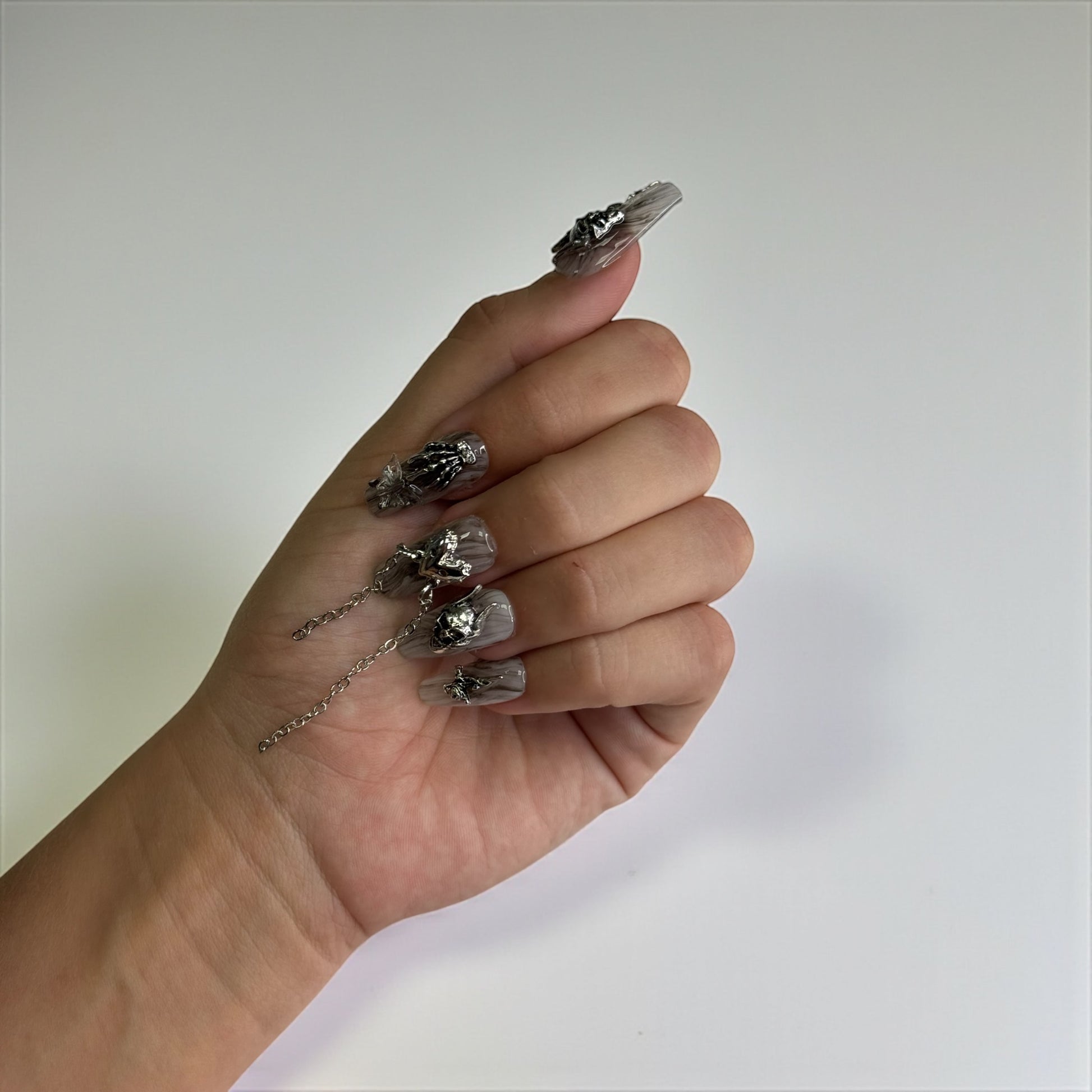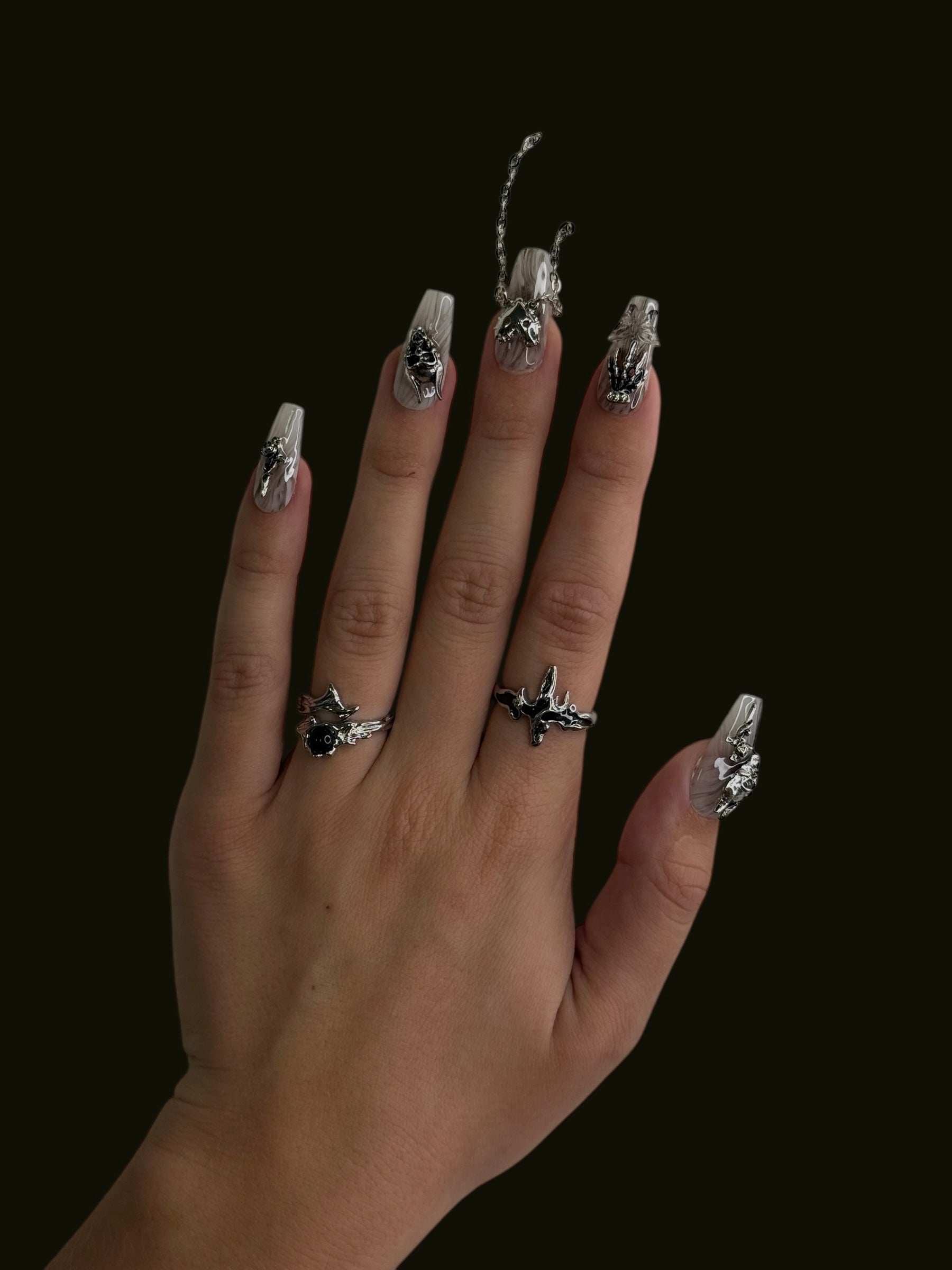 🩶Un set ultra audacieux qui allie une base transparente effet marbré avec des ornements argentés en 3D et des chaînes métallique . Idéal pour un look futuriste, edgy et totalement unique.⛓️✨
