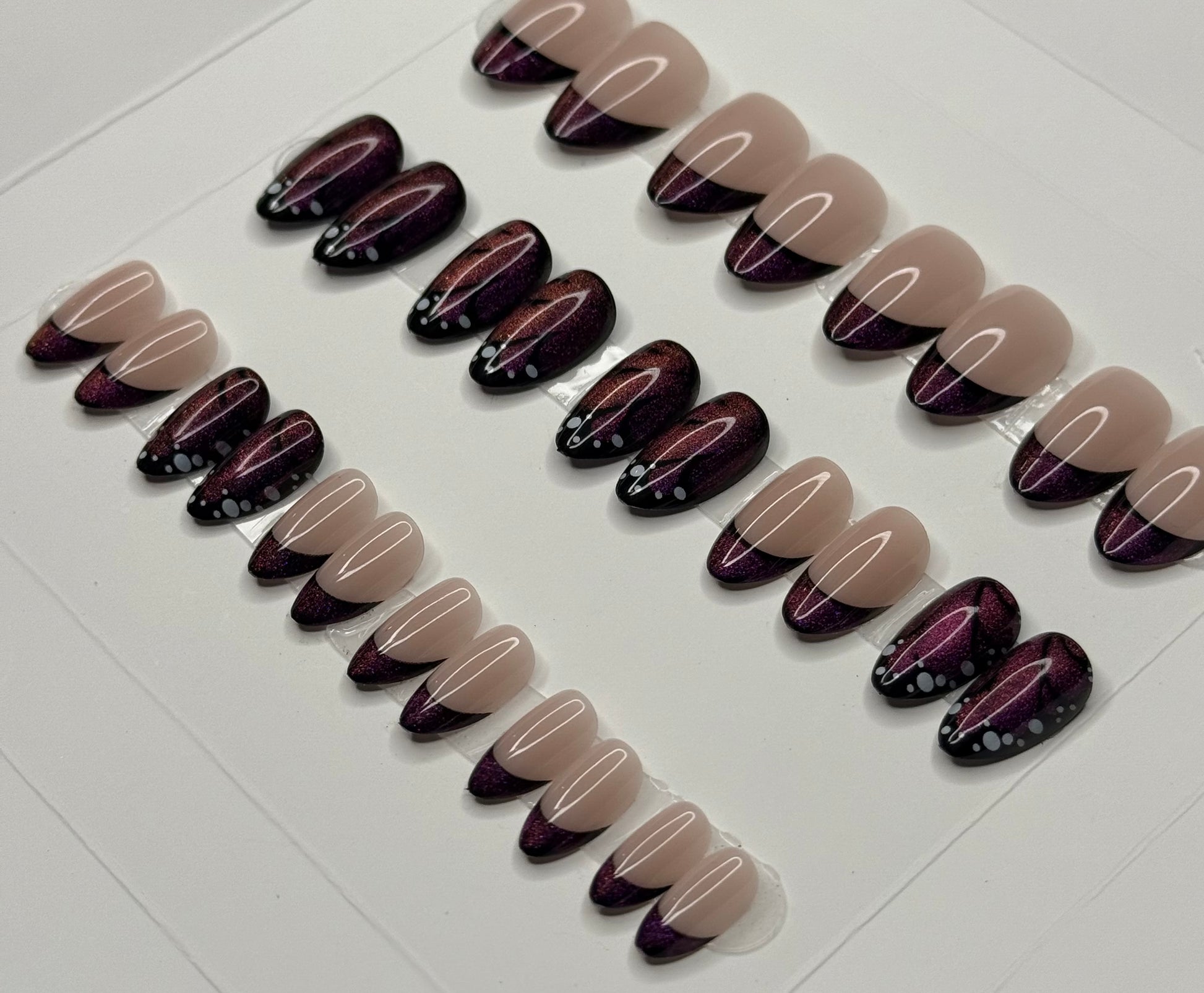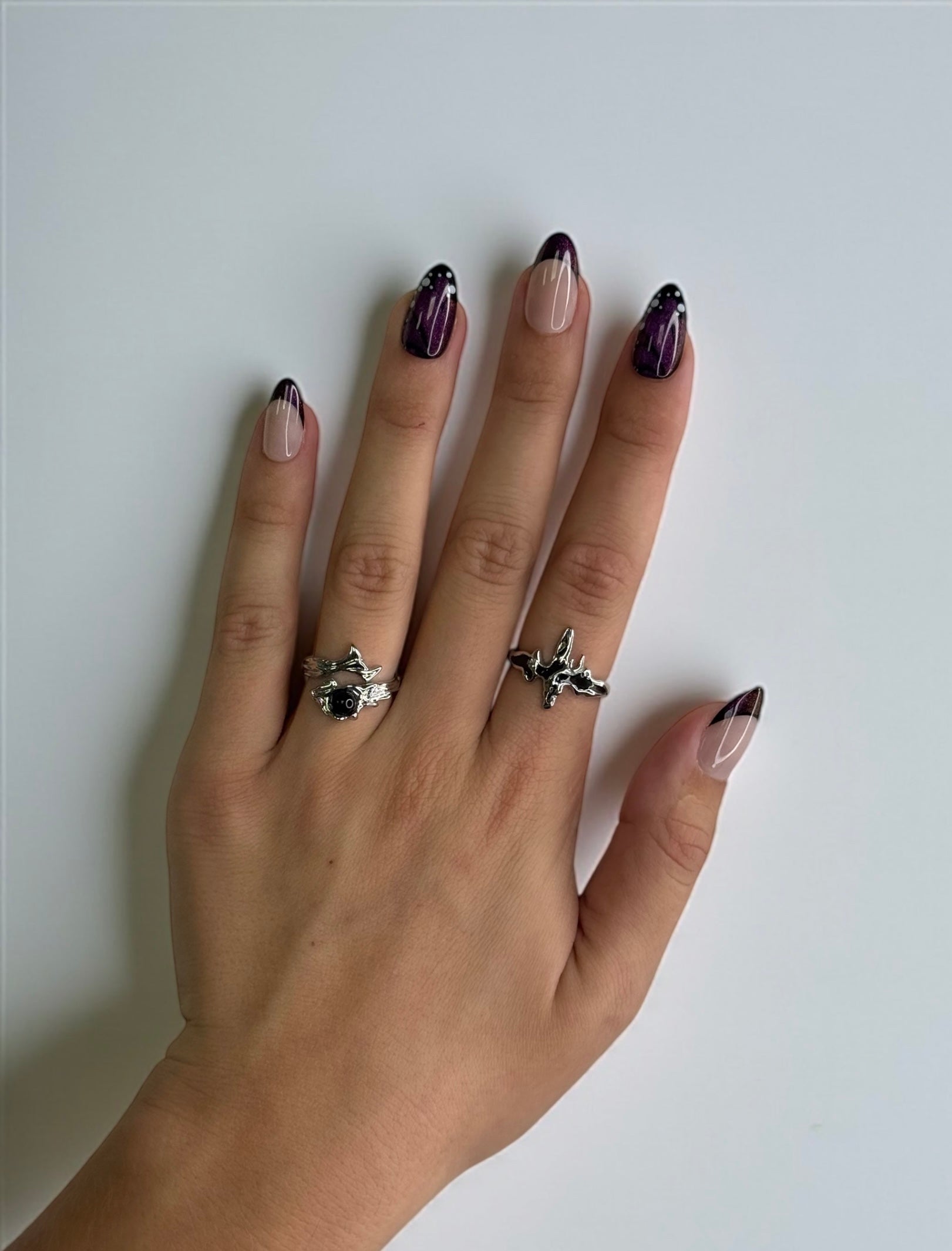 Les reflets violets profonds et les petits détails scintillants ajoutent une touche luxe et magnétique à chaque geste. 💫