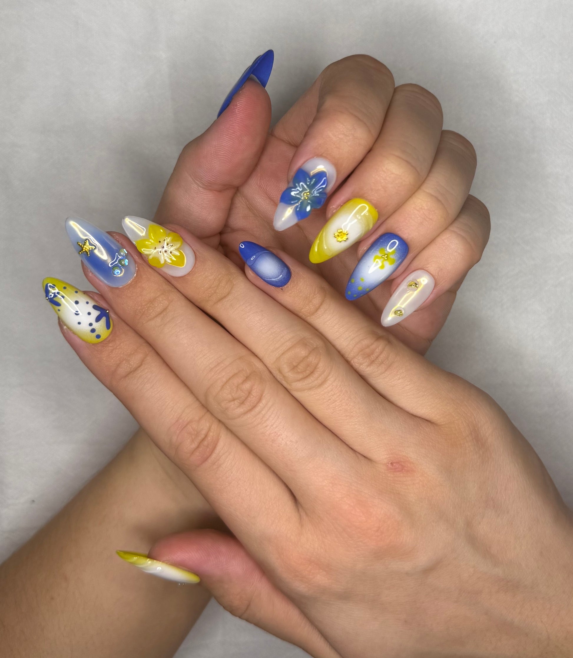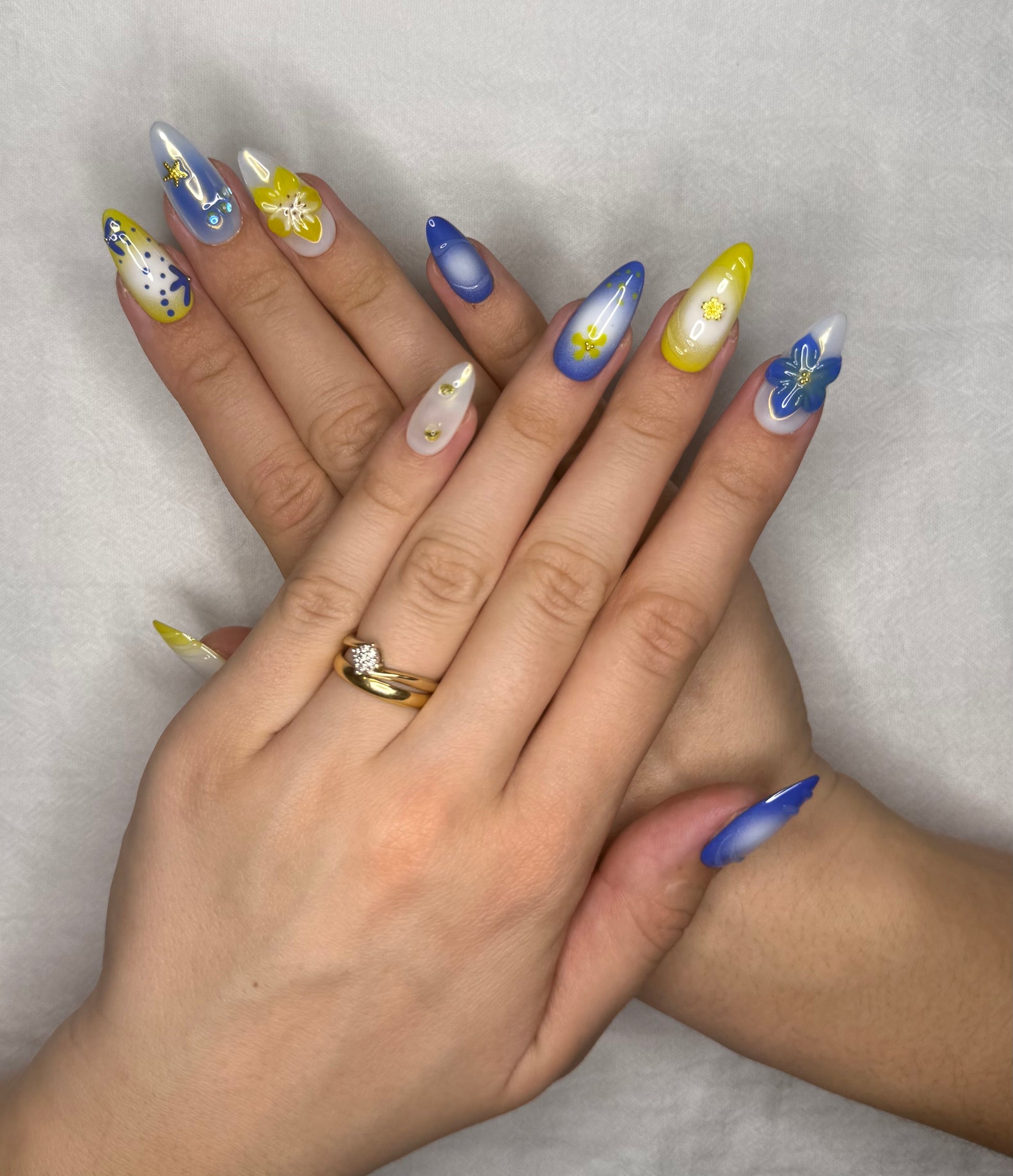Le set Romy allie élégamment le jaune moutarde, le bleu profond et le blanc nacré. Il est orné de fleurs en relief, de perles, de strass dorés et de motifs artistiques peints à la main. Un look estival et chic, parfait pour sublimer vos tenues avec originalité. 💙
