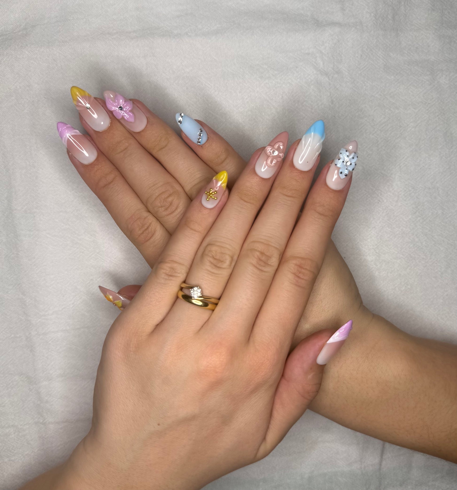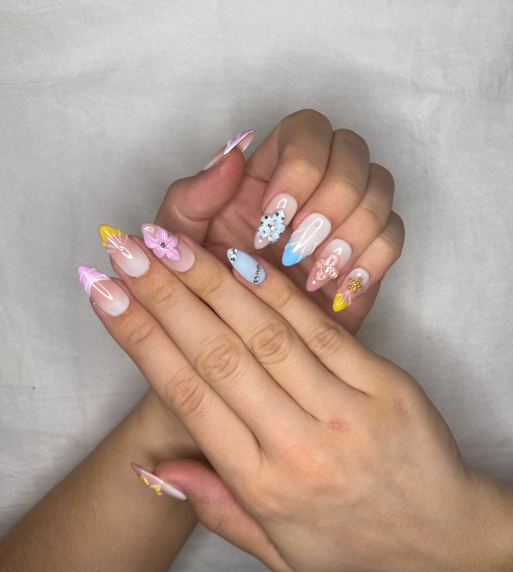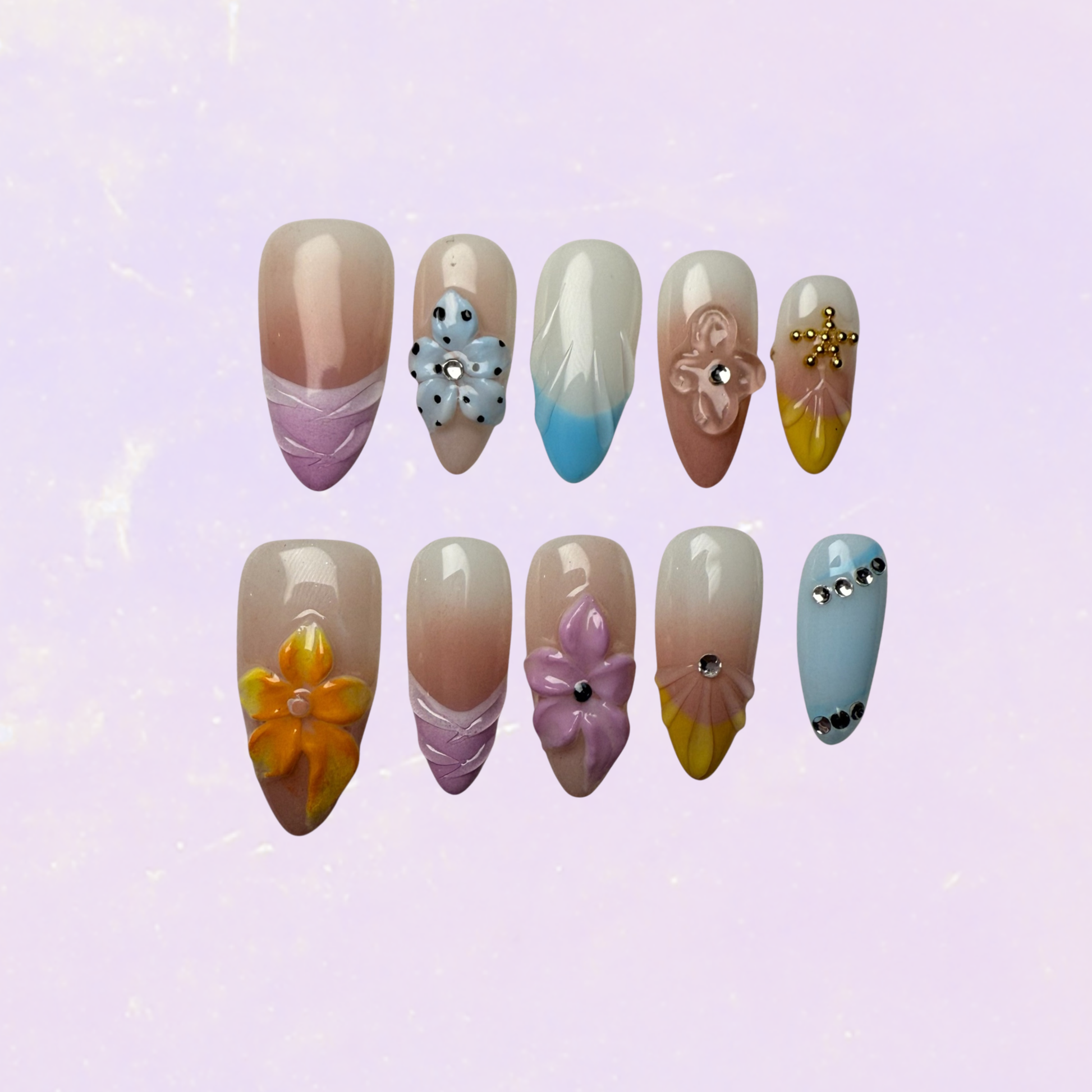 Ce set présente un style floral vif et frais, avec une base rosée/nude et des couleurs pastel dynamiques (jaune, bleu, lilas). Il se distingue par des fleurs en 3D, des strass brillants, et des pointes colorées — parfait pour un look estival et joyeux.💐